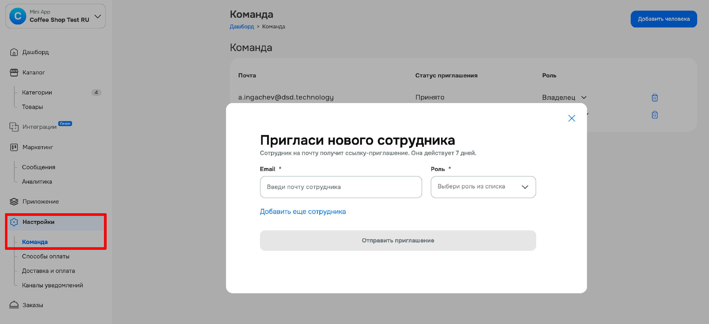 1. Выберите в боковом меню раздел "Команда" и нажмите кнопку "Добавить члена команды".
