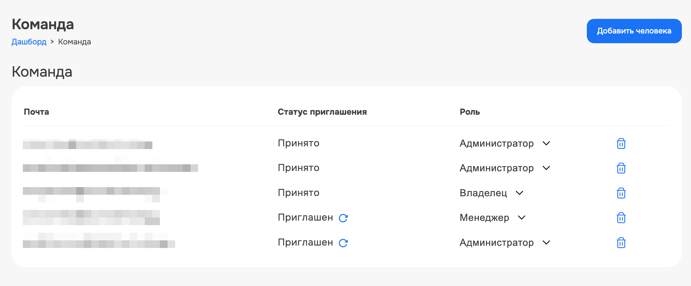 В этом же разделе можно посмотреть выданные приглашения и изменить роль/отозвать доступ у любого члена команды.